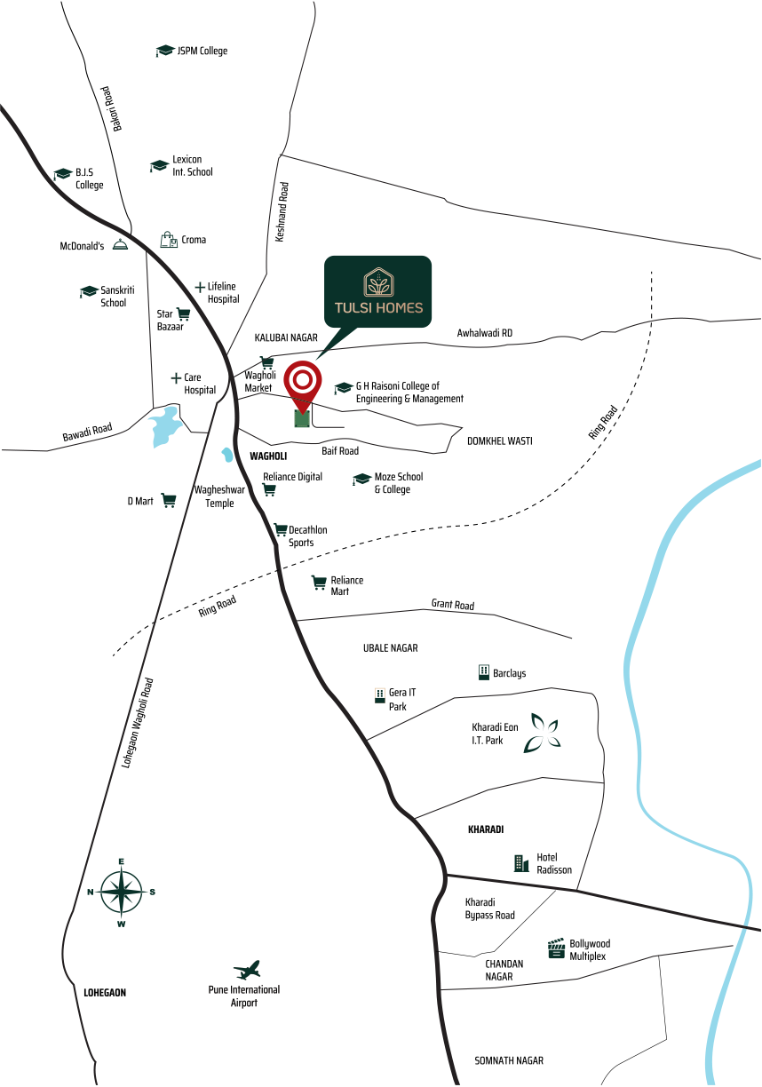 Nestled in the tranquil yet vibrant Wagholi, Tulsi Homes offers more than just spaces – it’s a destination where nature and modernity come together in perfect harmony. Each 1 and 2 BHK home is thoughtfully designed to fill your days with comfort, joy, and connection.